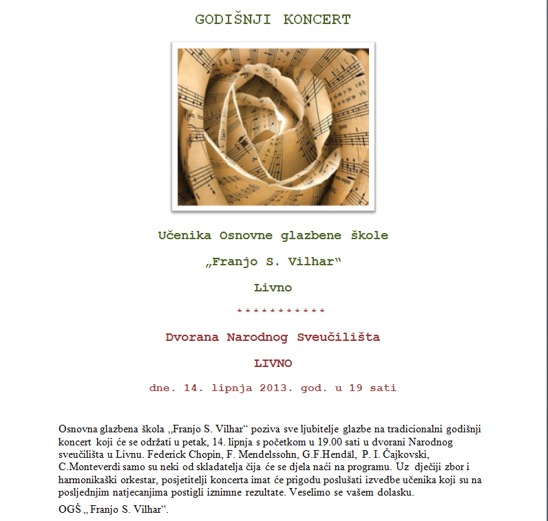 Osnovna glazbena škola „Franjo S. Vilhar“ poziva sve ljubitelje glazbe na tradicionalni godišnji koncert koji će se održati u petak, 14. lipnja s
