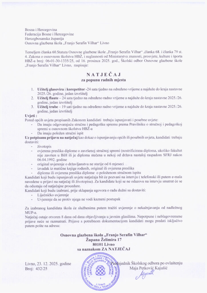 Natječaj za popunu radnih mjesta za 2025./26. godinu